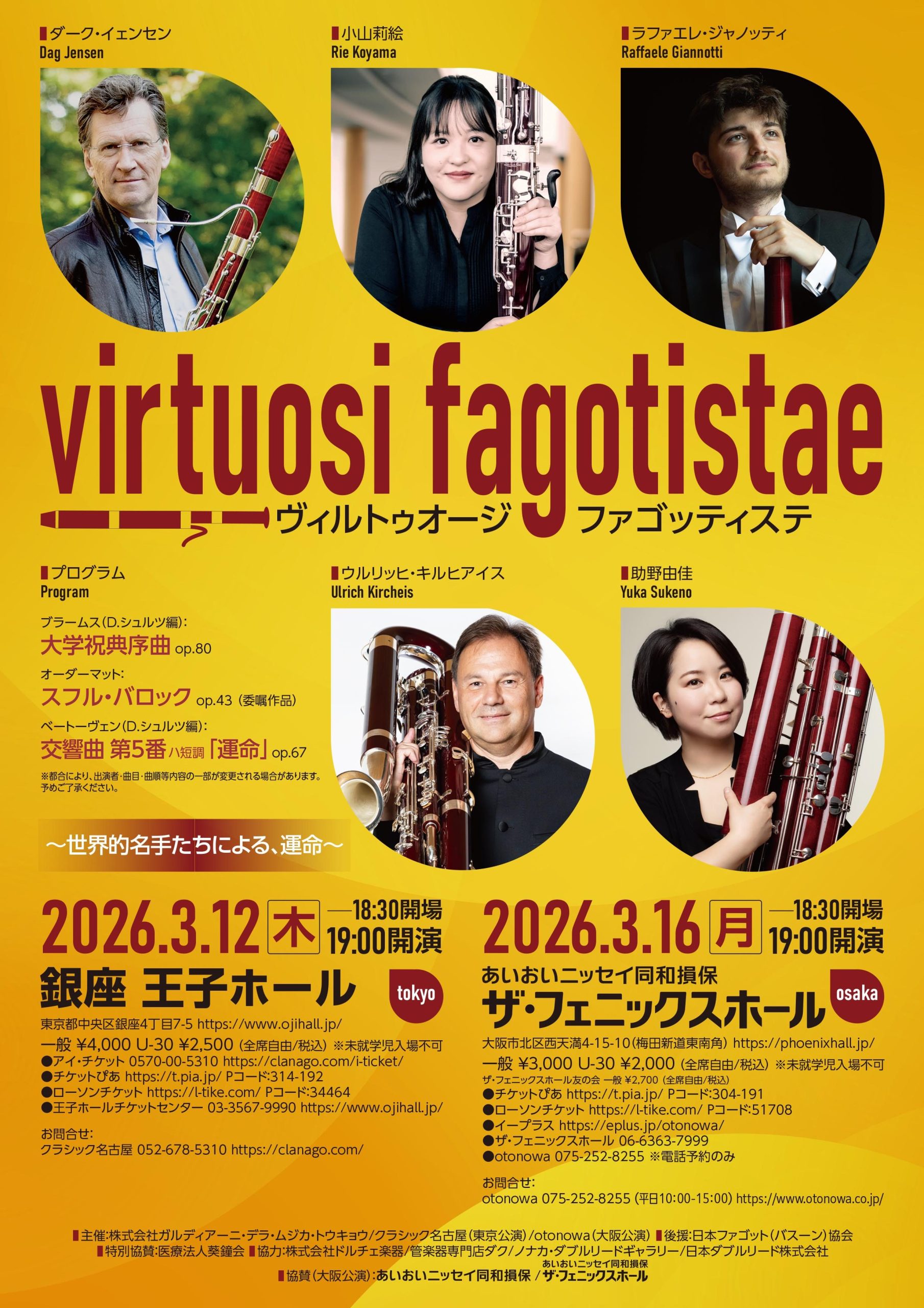 決してメジャーではないこの楽器がオーケストラの名曲を、ファゴットのみで演奏。世界的名手たちによる「運命」に是非ご来場ください。